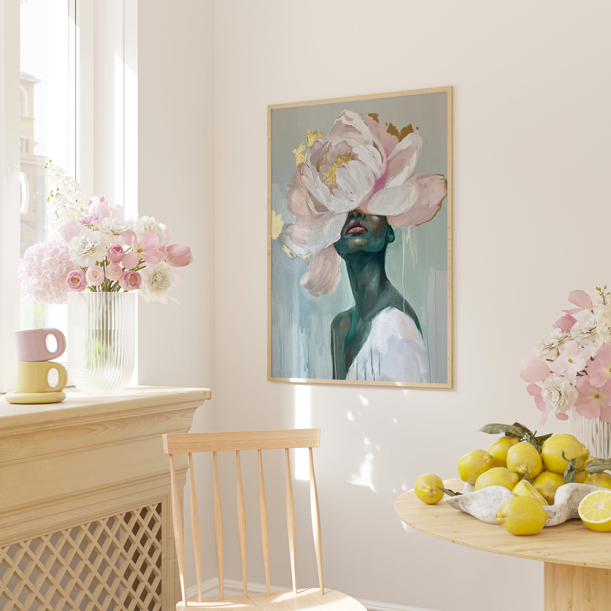 The use of muted greens and blues on the skin creates an almost ethereal quality, while the flower, painted in delicate shades of pink, dominates the canvas with gentle curves. Splashes of golden accents within the petals lend the piece a luxurious and dreamlike feel, suggesting a bloom not just of nature, but of the soul.